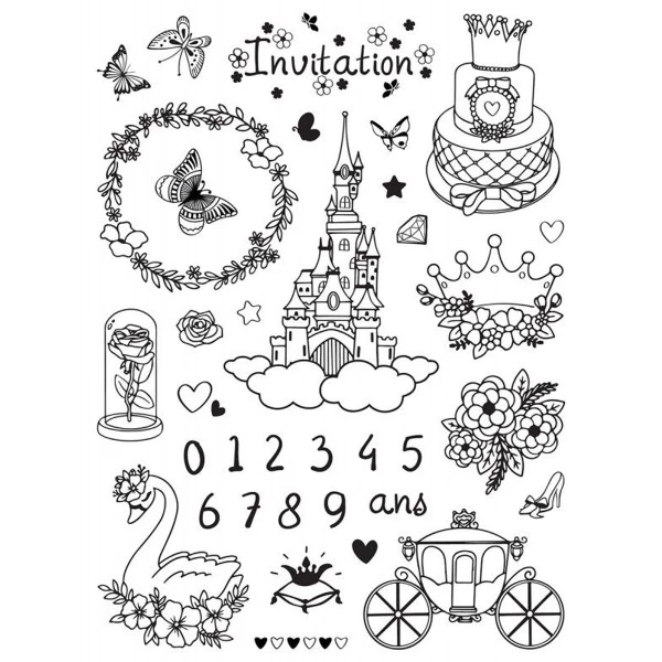 Description de Tampons Stampo Enfant – Anniversaire Princesse – 33 tampons + 3 encreurs