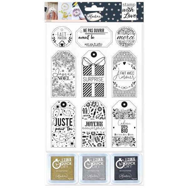 Ce joli set de tampons Étiquettes sera parfait pour créer vos propres étiquettes cadeaux pour n’importe quelle occasion. Il est composé de 9 tampons de 3,5 à 7,2 cm ainsi que de 3 encreurs : un noir à séchage rapide, 2 métallisés coloris doré et argenté.