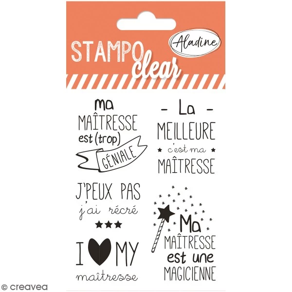 Ce set de 5 tampons Stampo Clear Maitresse est parfait pour vos créations de faire-part, scrapbooking, carterie, home déco ou toutes autres idées créatives.