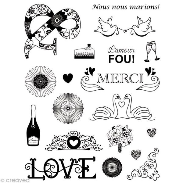 Ce set de 19 tampons transparents Mariage 3 sera parfait pour vos créations de carterie, faire-part, scrapbooking, décoration home déco ou tout autre idée créative.