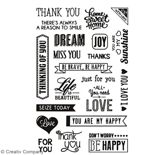 Planche de 11 x 15,5 cm contenant 22 tampons en silicone transparents (clear stamps), de différents motifs, sur le thème Mots anglais.avec différents motifs en silicone transparent.