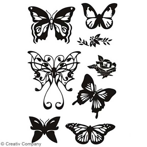 Planche de 11 x 15,5 cm contenant 8 tampons en silicone transparents (clear stamps), de différents motifs, sur le thème Papillons.avec différents motifs en silicone transparent.