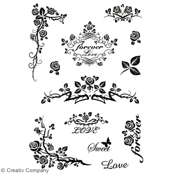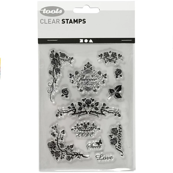 Planche de 11 x 15,5 cm contenant 12 tampons en silicone transparents (clear stamps), de différents motifs, sur le thème Pour toujours.avec différents motifs en silicone transparent.