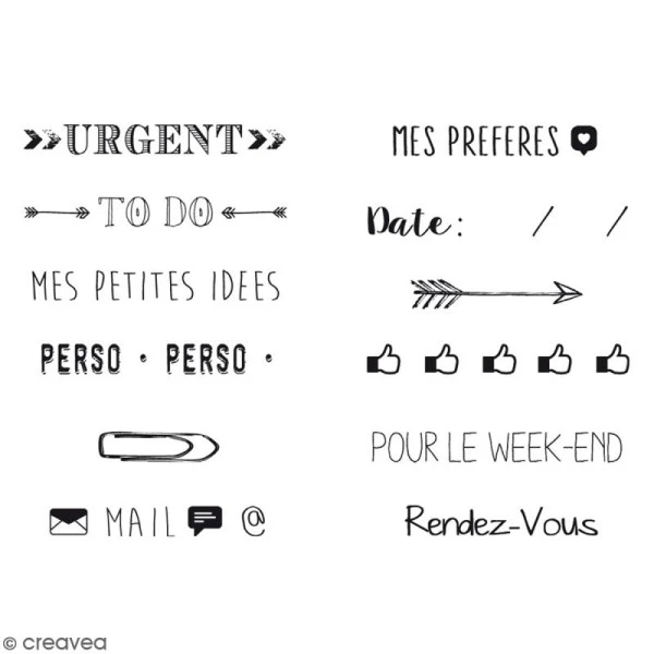 - Mots et motifsUrgent, To do, Mes petites idĂ©es, Perso, Trombone, Mail, Mes prĂ©fĂ©rĂ©s, Date, FlĂšche, Pouce en l’air, Rendez-vous et Pour le week-end