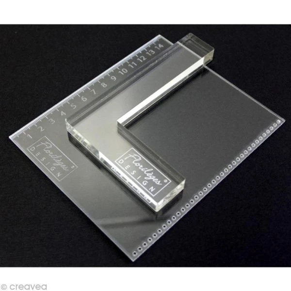 Equerre et plaque de repérage en plastique transparent pour technique du tampon.