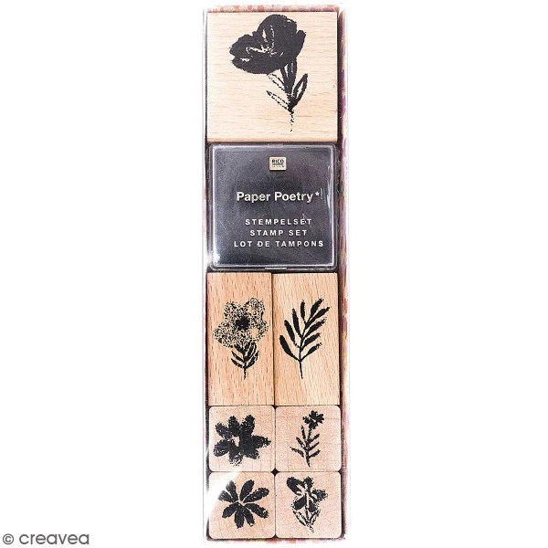 Cet assortiment de tampons bois contient 7 tampons et 1 encreur noir. Vous pouvez ainsi imprimer facilement toutes sortes de motifs floraux sur vos papiers, cartes, faire-part, scrapbooking, etc. Ces tampons Paper Poetry (Nature) de Rico Design vous offriront de nombreuses possibilités créatives et décoratives !