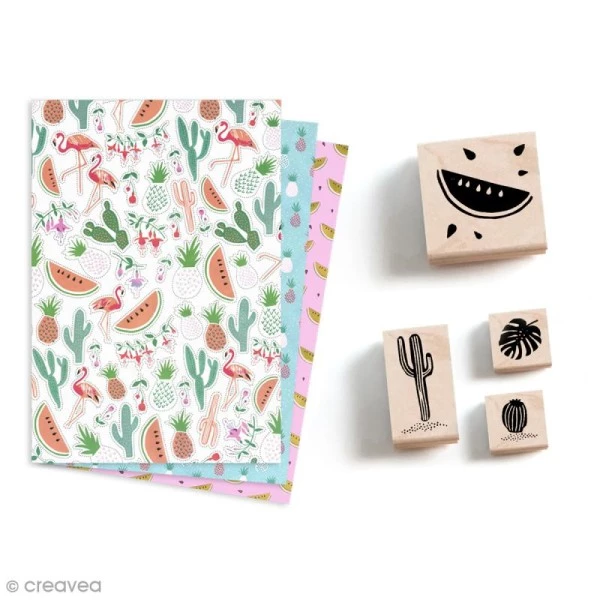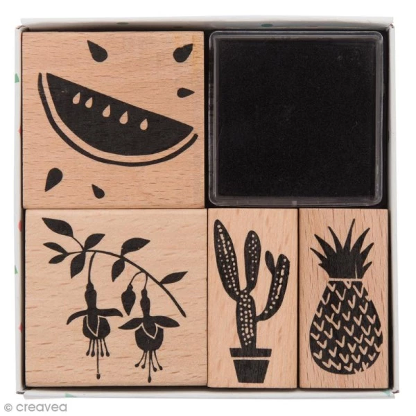 Cet assortiment de tampons bois contient 5 tampons et 1 encreur noir. Vous pouvez ainsi imprimer facilement toutes sortes de motifs estivaux sur vos papiers, cartes, faire-part, etc. Ces tampons Paper Poetry (Tropical Spring Melon) de Rico Design vous offriront de nombreuses possibilités créatives et décoratives !