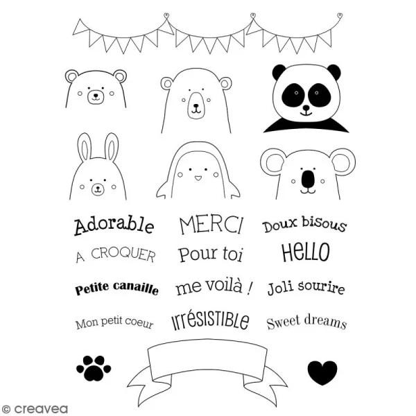 Ces tampons sont à monterassemblez un visage d’animal et une bannière à message pour avoir le motif final ! Les combinaisons sont multipes !